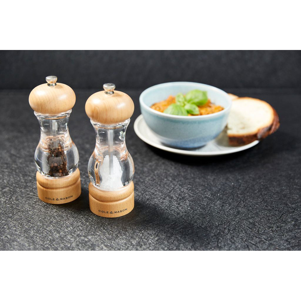 A classic set of salt and pepper mills made from acrylic and beech from a sustainable source. The beech has been finished with a clear lacquer to allow the natural beauty of the wood grain to shine through. The 105 Beech Wood Gift Set offers transparent acrylic so you can view the contents knowing, which is which, plus, knowing when it is time to fill up. The Cole & Mason Precision Mechanism does not crush peppercorns but strips them to release maximum flavour with each turn. The salt mill features the diamond sharp ceramic mechanism cutting through the hardest of salt and peppers, allowing for a smooth and even turn. You can easily adjust the grind from fine to course with ease. For peace of mind the 105 Beech Wood Mill mechanisms come with a lifetime guarantee and beautifully packaged ready for gifting.