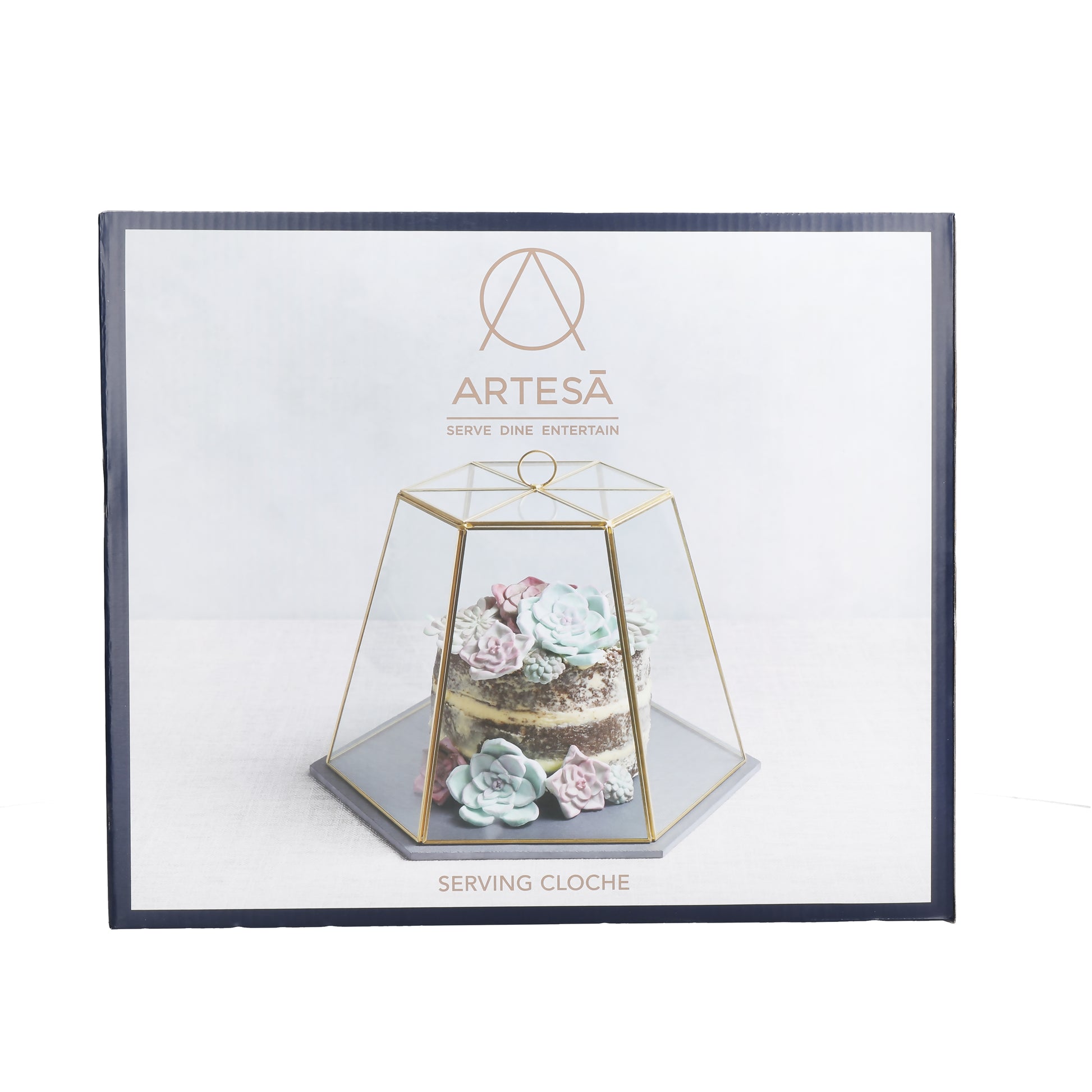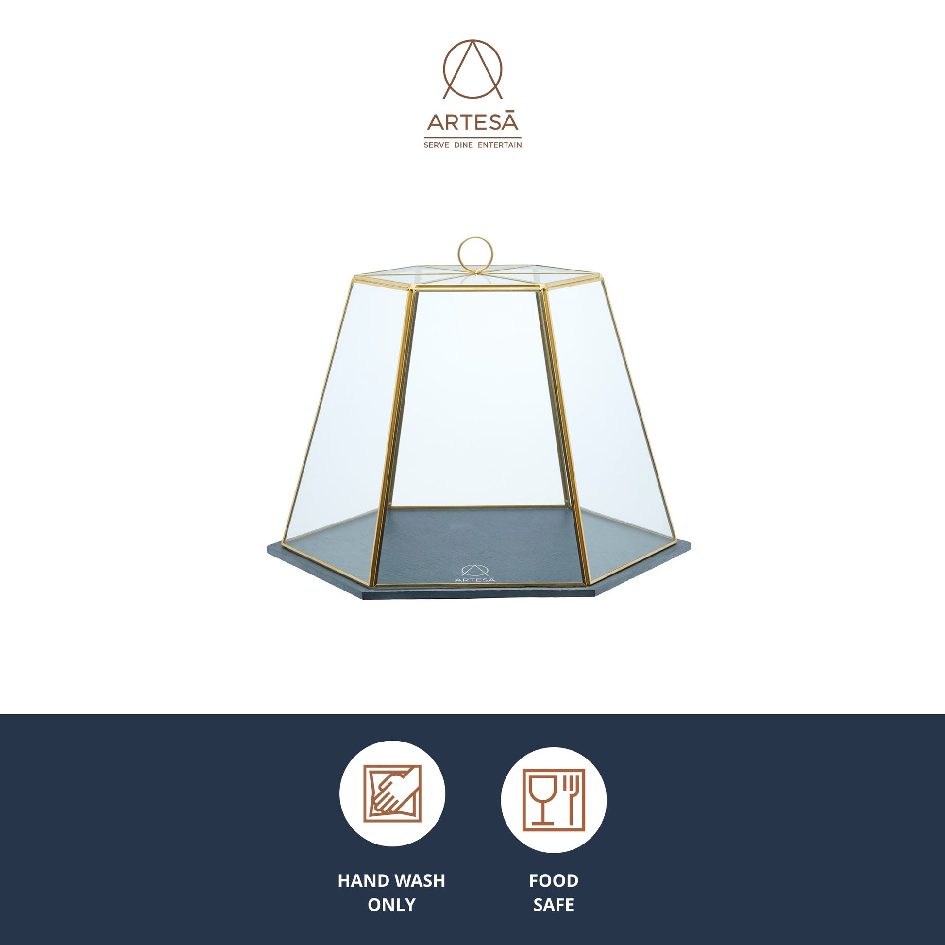 • PRESENT CAKES, CANAPES AND CHEESE IN STYLE: with Artesà's geometric glass cloche and slate board• SHINES UNDER AMBIENT LIGHTING: the hexagonal lid is finished with a glowing brass-coloured frame