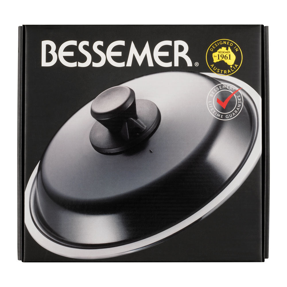 A kitchen staple for decades, nothing completes your kitchen quite like Bessemer® cookware and nothing completes your cookware like the Bessemer® Universal Lid. This must-have Bessemer® accessory is ideal for pairing with your Bessemer® cookware that has an 24cm diameter to help minimise mess and splashback while also allowing foods to steam, simmer, and boil. Featuring a modern high dome design with integrated steam ventilation, the Bessemer® Universal Lid provides perfect control over your cooking. Crafted from the highest quality food grade materials with ceramic coating to ensure unparalleled non-stick, the Bessemer® Universal Lid is truly made to last. Fitted with a stay-cool Bakelite knob, oven safe up to 180°C, that allows for safe handling, the Bessemer® Universal Lid is PFOA, Lead and Cadmium free for peace of mind. Food definitely tastes better in a Bessemer®.