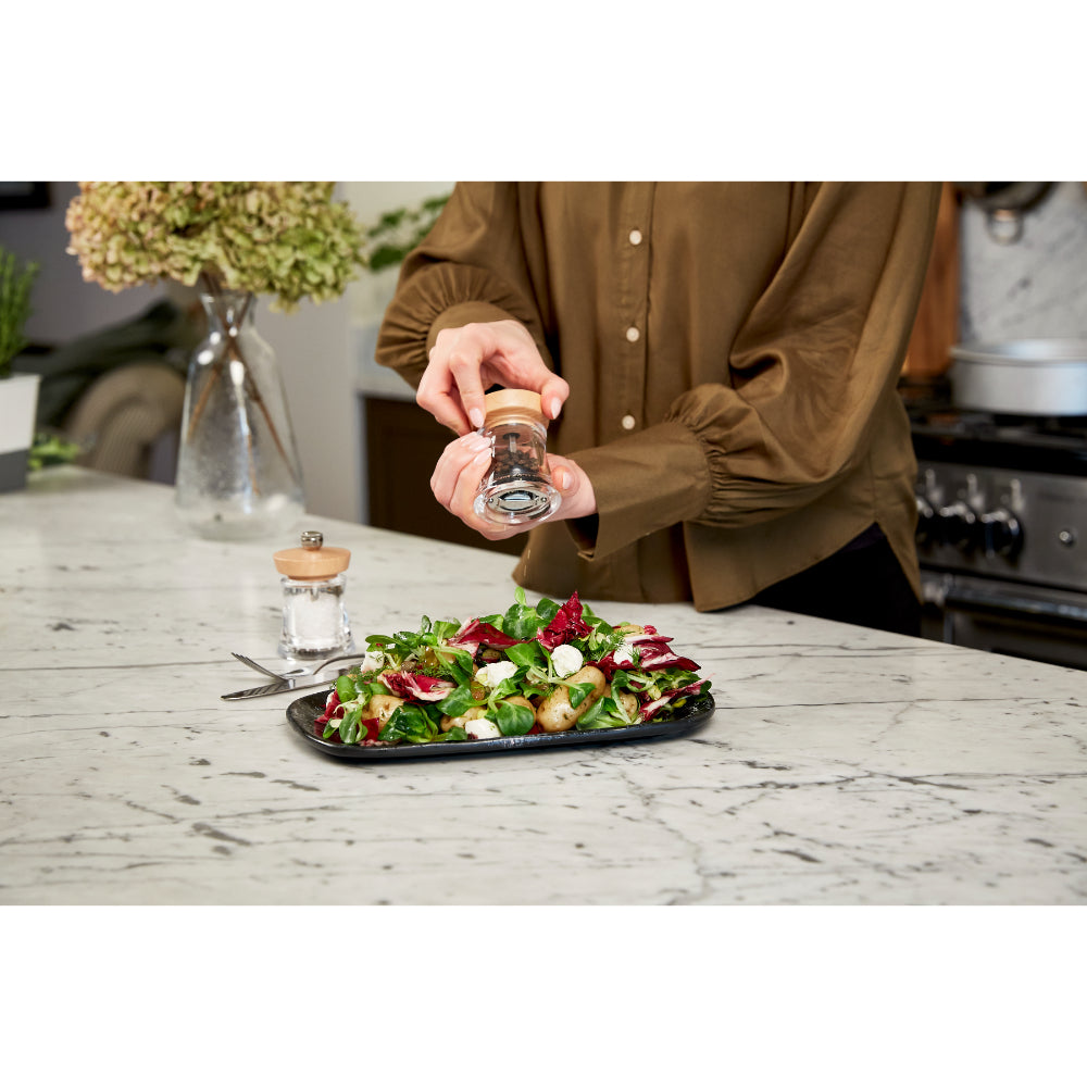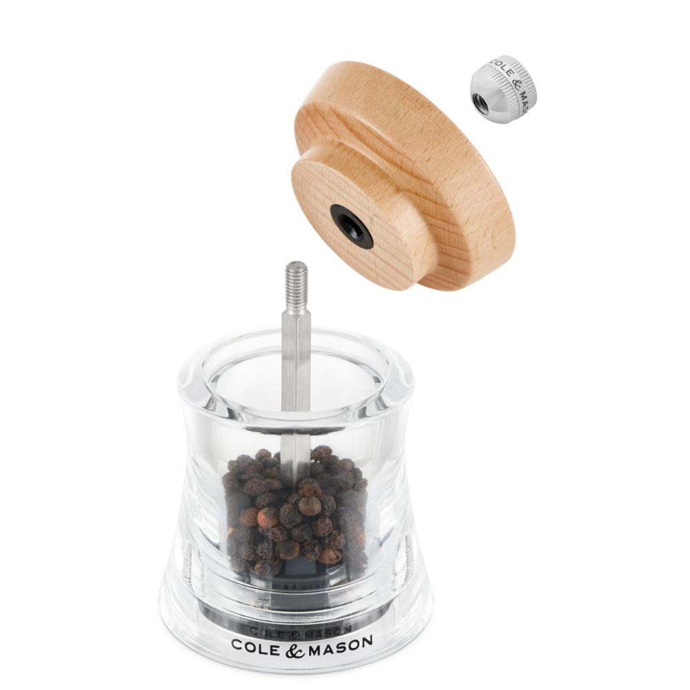 Made from durable acrylic and high-grade beech wood and standing only 95mm tall, with its squared edges and stainless-steel collar, the Cole & Mason Holborn 95mm Pepper Mill has a contemporary and bold yet timeless aesthetic. Its innovative design and premium quality are synonymous with the Cole & Mason brand. The versatility of the acrylic finish makes this mill perfect for both traditional and modern kitchens. Easily adjust the grind from fine to coarse by turning the knob on the top of the mill. Made from durable acrylic and high-grade beech wood.