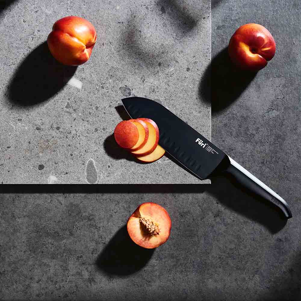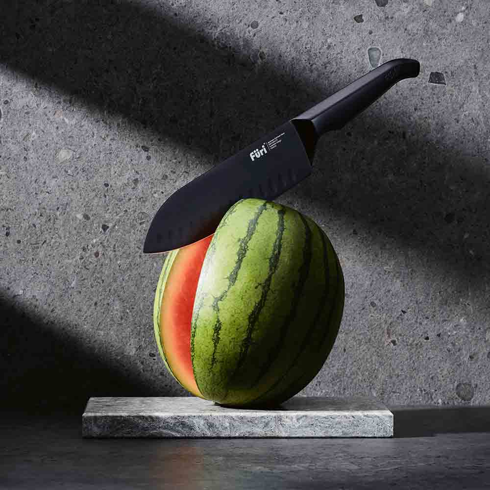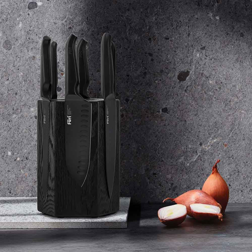 The versatile Furi Jet Black Magnetic Hexagonal knife block holds knives on the outside, for easy identification, or more discreetly inside; or in a combination of both. The block comes with six Furi knives constructed from X50CrMoV15 Japanese stainless steel.