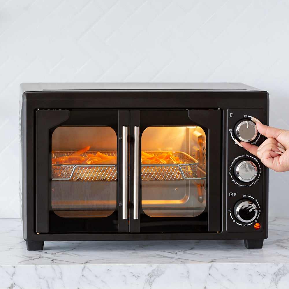 • Includes Baking pan, Air Fry Basket, Pizza Stone, Wire rack, Rotisserie fork set