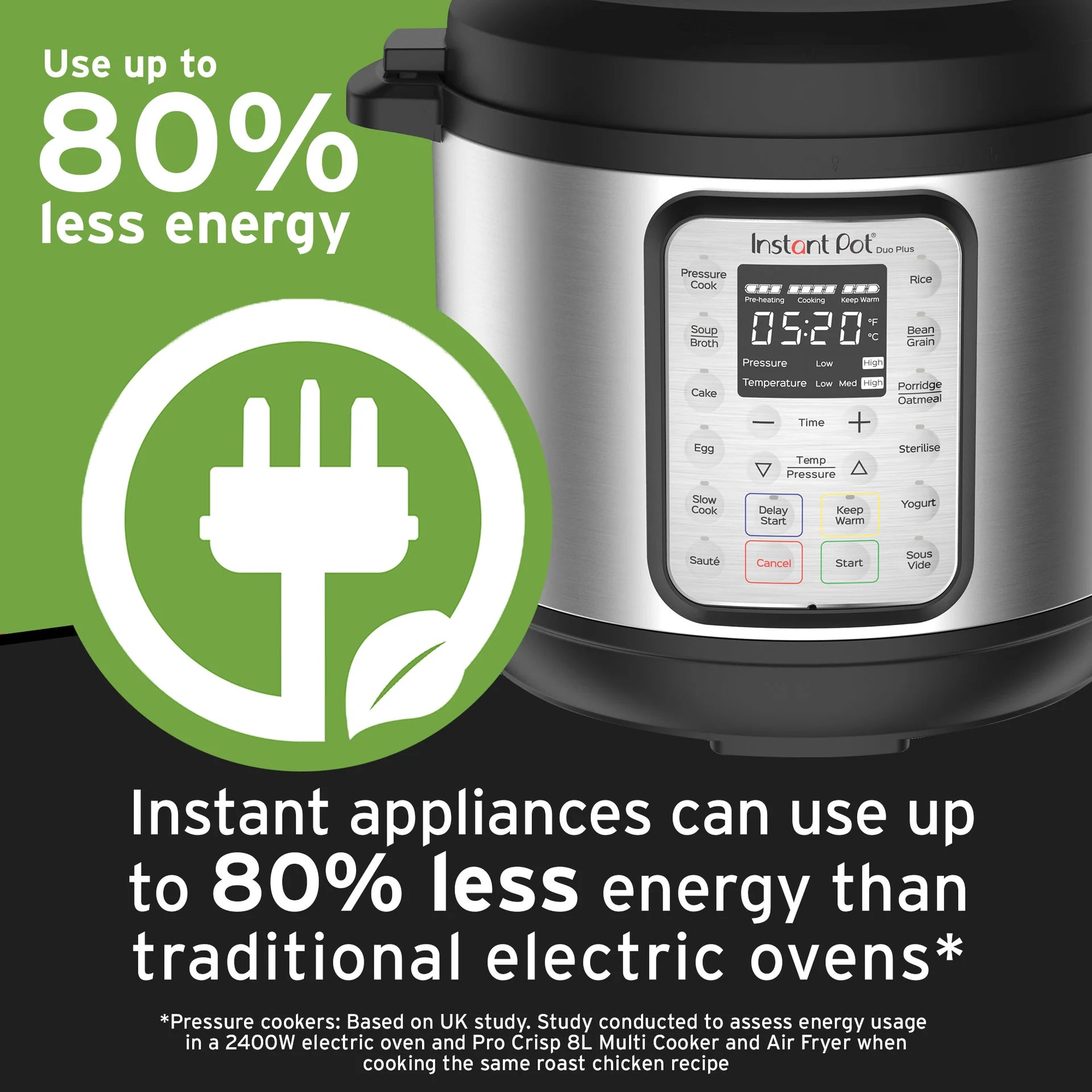 • 9 appliances in 1: electric pressure cooker, rice cooker, slow cooker, yogurt maker, steamer, sauté pan, sous vide, steriliser and food warmer plus 13 customisable smart programmes for quick one-touch cooking: pressure cook, soup/broth, cake, egg, slow cook, sauté, rice, bean/grain, porridge/oatmeal, sterilise, yogurt, sous vide and keep warm