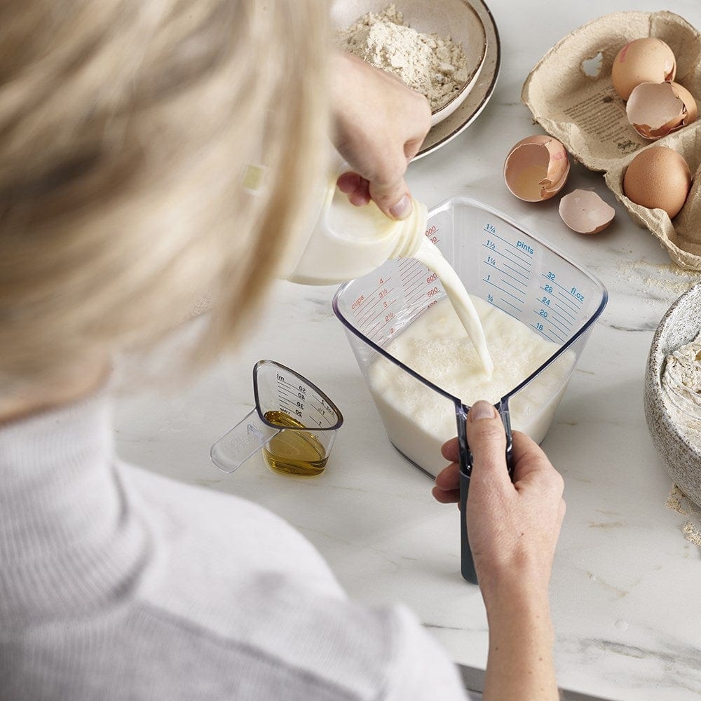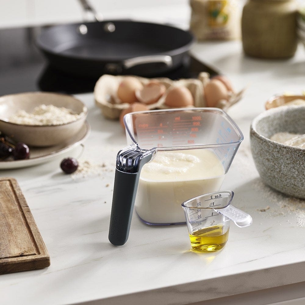 Making pouring and measuring effortless with the Joseph Joseph Align 2 Piece Easy Read Measuring Jug Set. The specifically designed corners allow for ease of pouring and no mess cooking. There is no need to check the measurement from the side – the volumes have been added to the inside of the jug so they may be checked from above. This product is a two in one, featuring a mini jug for measuring smaller amounts, and a larger for higher volumes. You may measure liquids up to 50ml and 1L, respectively. To ensure you maintain the quality of your product, hand wash only and avoid using in a microwave.