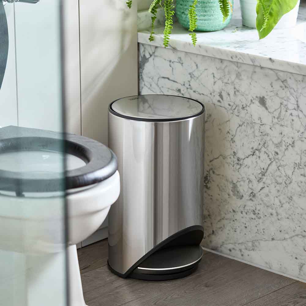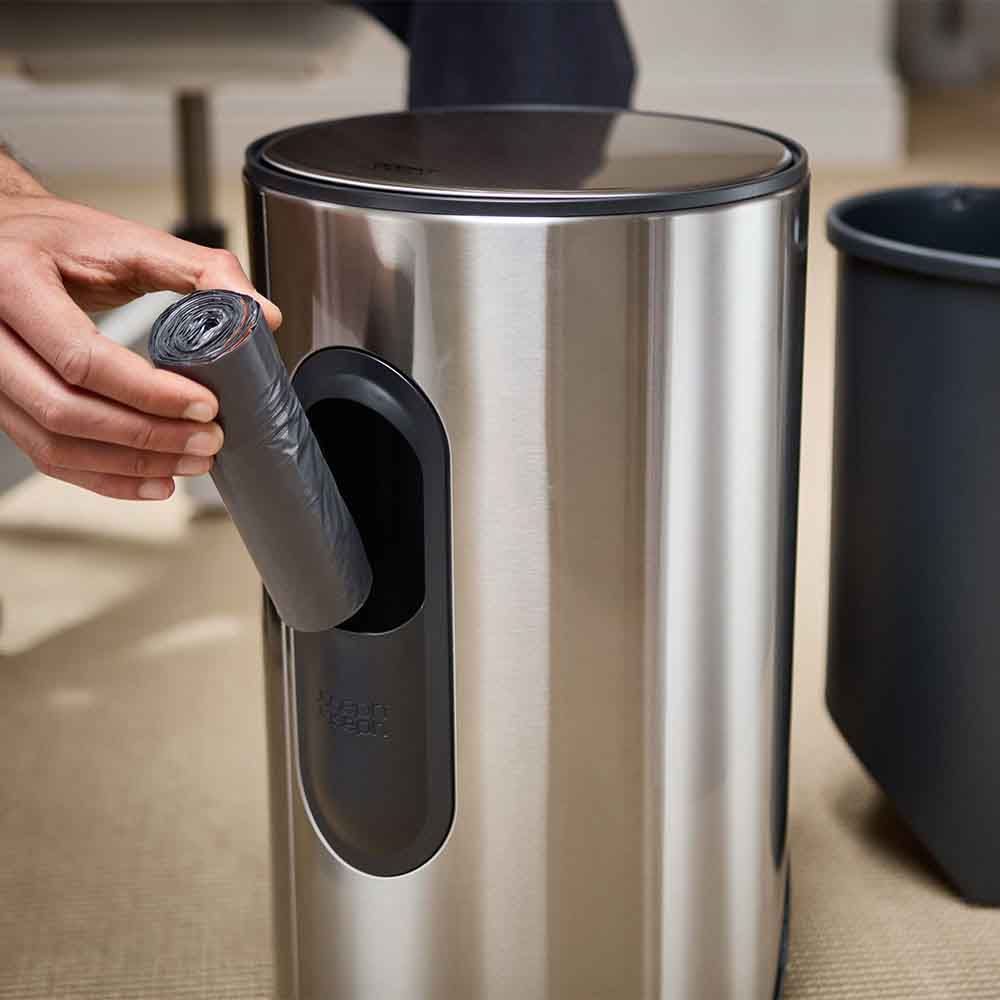 This streamlined, circular bin has a large pedal that fits neatly within the footprint of the bin, making it easy to open and saving valuable floor space. It also features a handy storage compartment for liner rolls, a soft-close lid with a fingerprint-proof coating and integrated odour control via a replaceable filter in the lid. Finished in stylish stainless steel, it has an easy-empty removable bucket and is compatible with Joseph Joseph IW5 custom-fit liners.