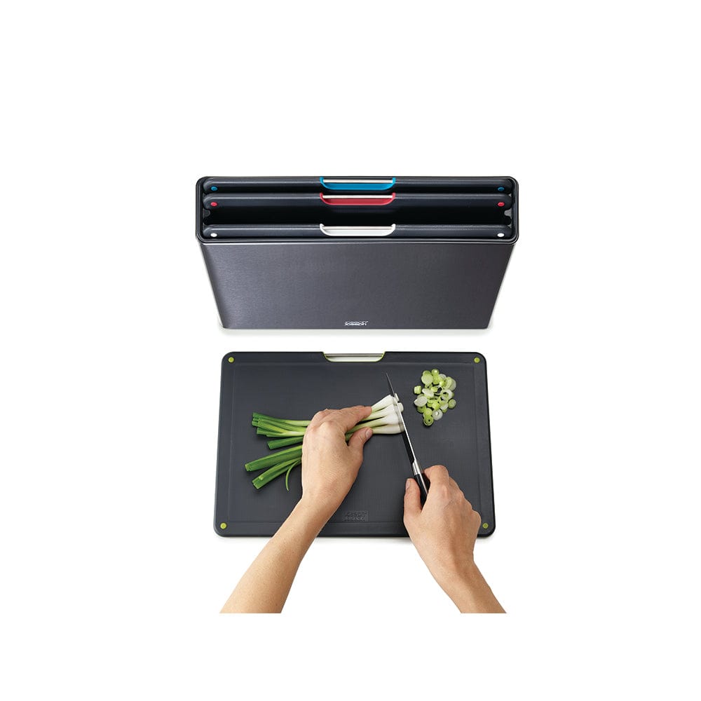 Prepare your meals in style with the beautifully designed Joseph Joseph Folio Steel 4 Piece Choping Board Set