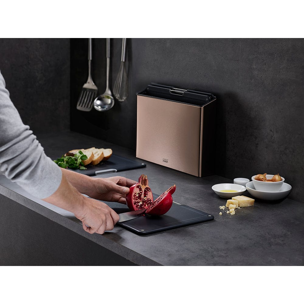Elevate your at home culinary experience with the Joseph Joseph Folio Steel 4 Piece Chopping Board Set. Comprising of a sleek slimline case and four chopping boards, the set will look fantastic placed on the countertop of a host of different style kitchens. With four colour coded chopping boards to help avoid cross contamination, each board benefits from a double sided textured cutting surfaces and non-slip feet for safe chopping, slicing and dicing. The innovative case from the Joseph Joseph Folio Steel 4 Piece Chopping Board Set holds the boards separate so the air can circulate around them to avoid bacteria growth. The case also benefits from a fingerprint proof stainless steel outer that is effortless to keep clean. The Joseph Joseph Folio Steel 4 Piece Chopping Board Set is available in stylish stainless steel, rose gold and carbon black colours to complement your kitchen.