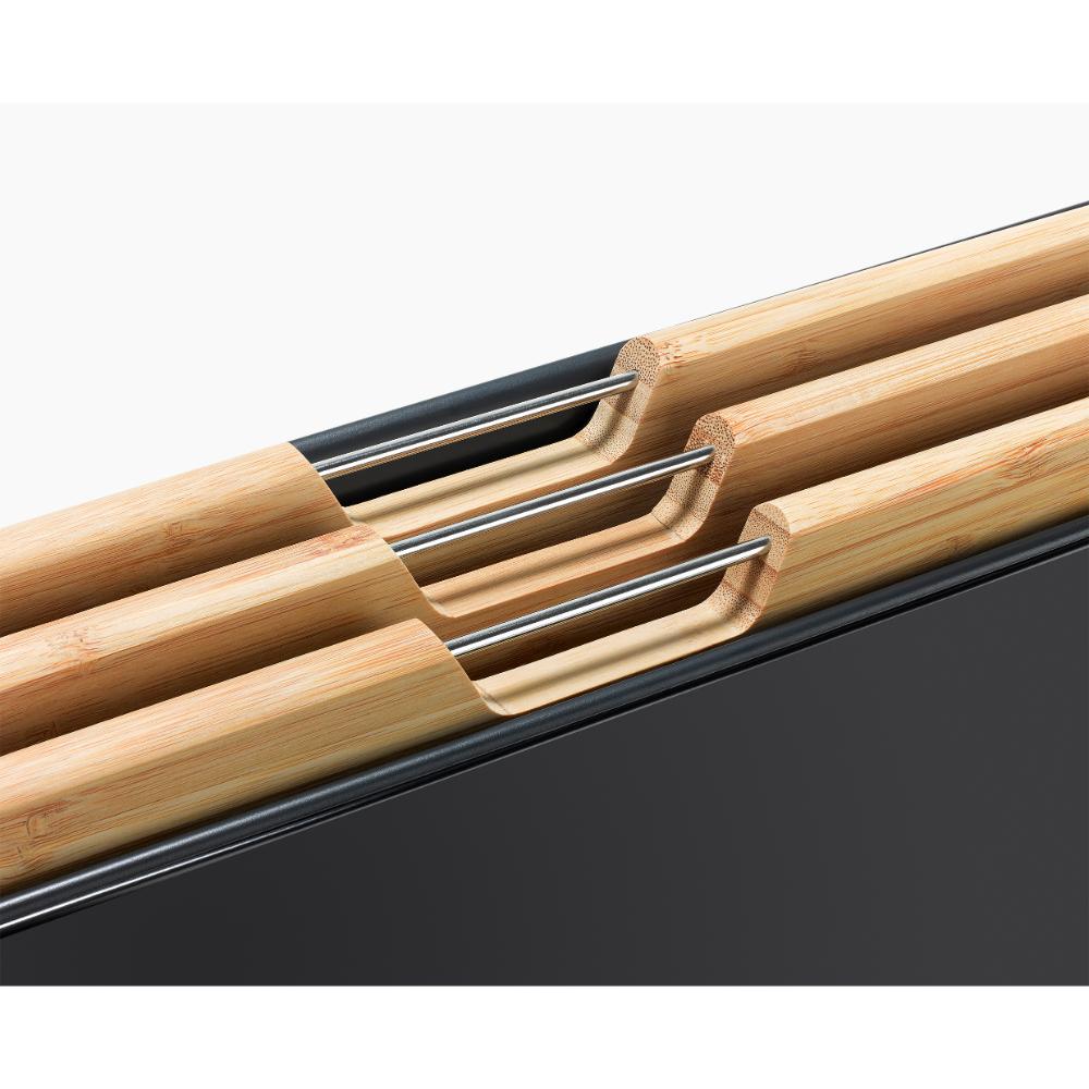 Having multiple boards on hand is convenient, but storage can be a challenge. That's why we designed Folio™. This set of three chopping boards is housed in a sleek stainless-steel case, keeping your worktop neatly organised. Each board is crafted from bamboo which naturally makes a tough cutting surface, whilst the addition of non-slip feet makes for secure chopping. An angled fingerprint-proof case holds the boards apart, allowing air to circulate for efficient drying. Plus, stainless-steel selecting bars on each board make them easy to remove from the case. Board size: 36 x 26 cm (14.2 x 10.2 inches).