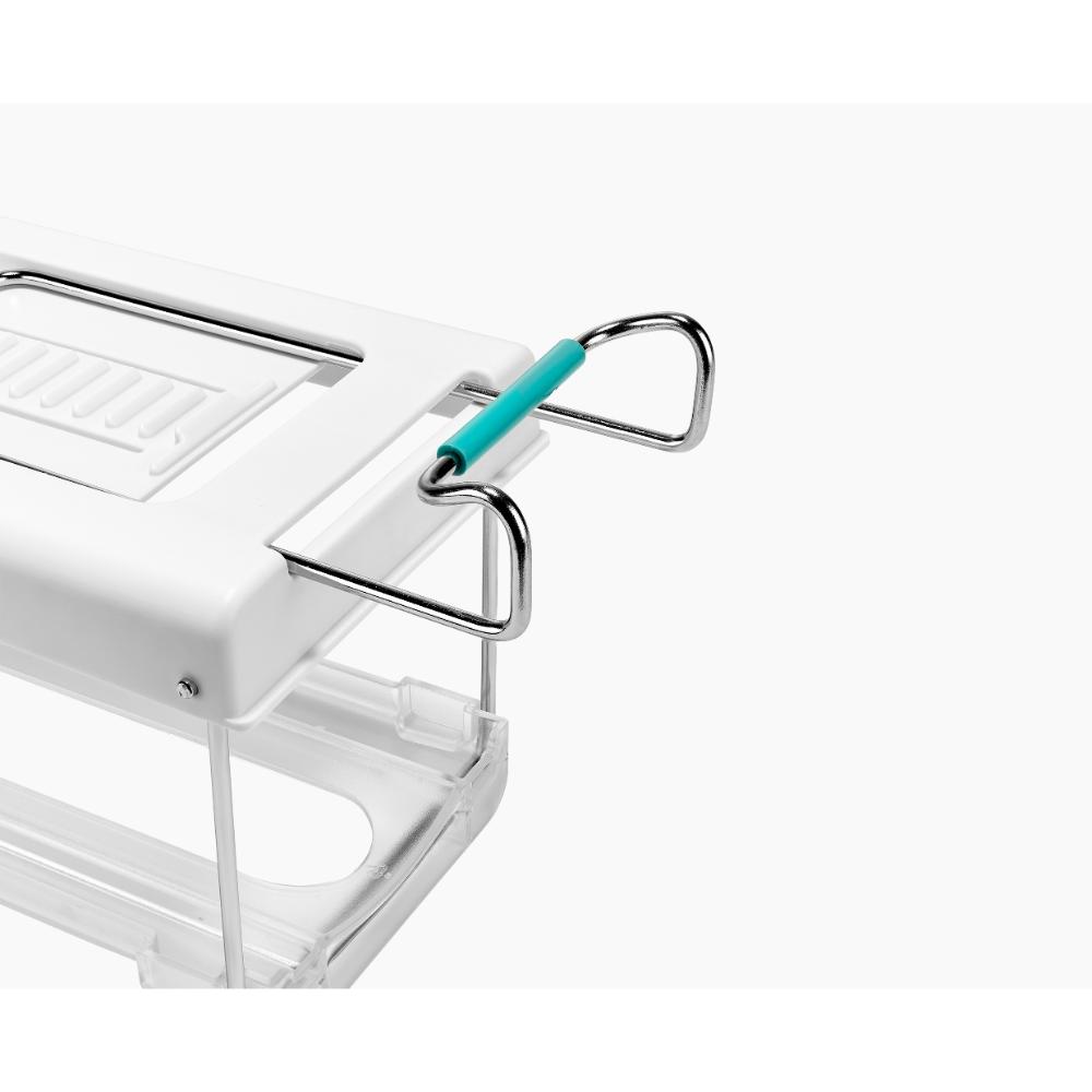 Storing bottles in your fridge can be challenging, often leading to unstable stacking and limited space. This innovative design solves the problem by clipping underneath shelves, creating convenient, easy-access bottle storage that makes use of unused space. It’s large enough to hold standard bottles of wine and champagne and is easy to install with clips on both the front and back for a secure fit. When not in use, the holder neatly folds away — just pull it towards you and push upwards — allowing you to store items beneath.