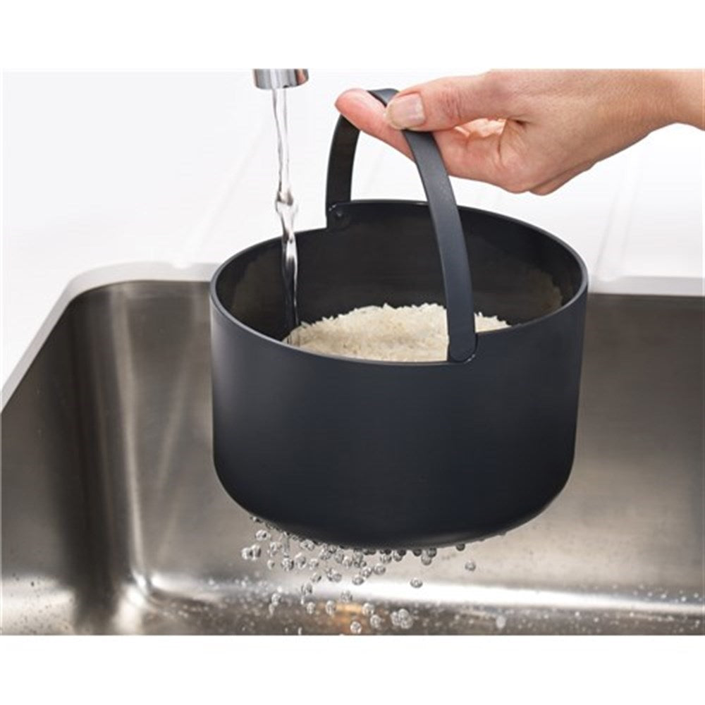 Measure, wash, cook and serve delicious fluffy rice and grains with the Joseph Joseph M Cuisine Rice Cooker. This innovative microwave rice cooker allows you to cook your rice in minutes without the hassle of boiling it in a pan and using different utensils to measure and drain the rice. The M Cuisine Rice Cooker is made up of a 2L cooking pot, a colander, measuring cup and multi-purpose rice paddle that also locks the lid closed and works as a convenient carry handle. To use the Joseph Joseph M Cuisine Rice Cooker, measure out the desired quantity of rice into the colander, rinse and drain and place the colander in the cooker pot, then add the water and secure the lid with the rice paddle.