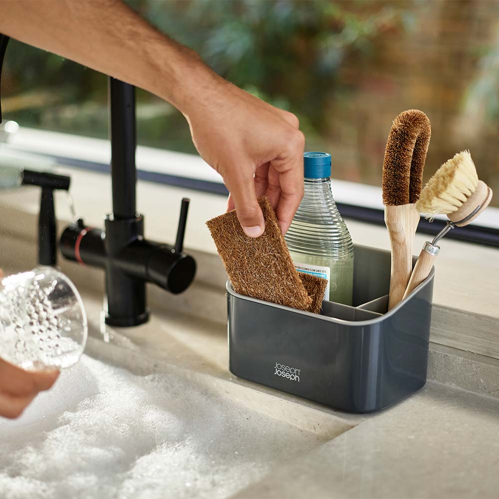 Keep your sink space neatly organised with this stylish Joseph Joseph SinkStore™ Tiered Sink Tidy. It features a generous storage compartment that's divided into three sections for holding a large washing-up liquid bottle, a dish brush, sponges, and scourers. Made of durable plastic the sink tidy can handle the rigorous after dinner clean ups, plus discreetly keep the contents inside hidden from guests view. The angled top makes access easier, and the divider can be removed for easy cleaning. Complete the kitchen set up with the coordinating Joseph Joseph collection.