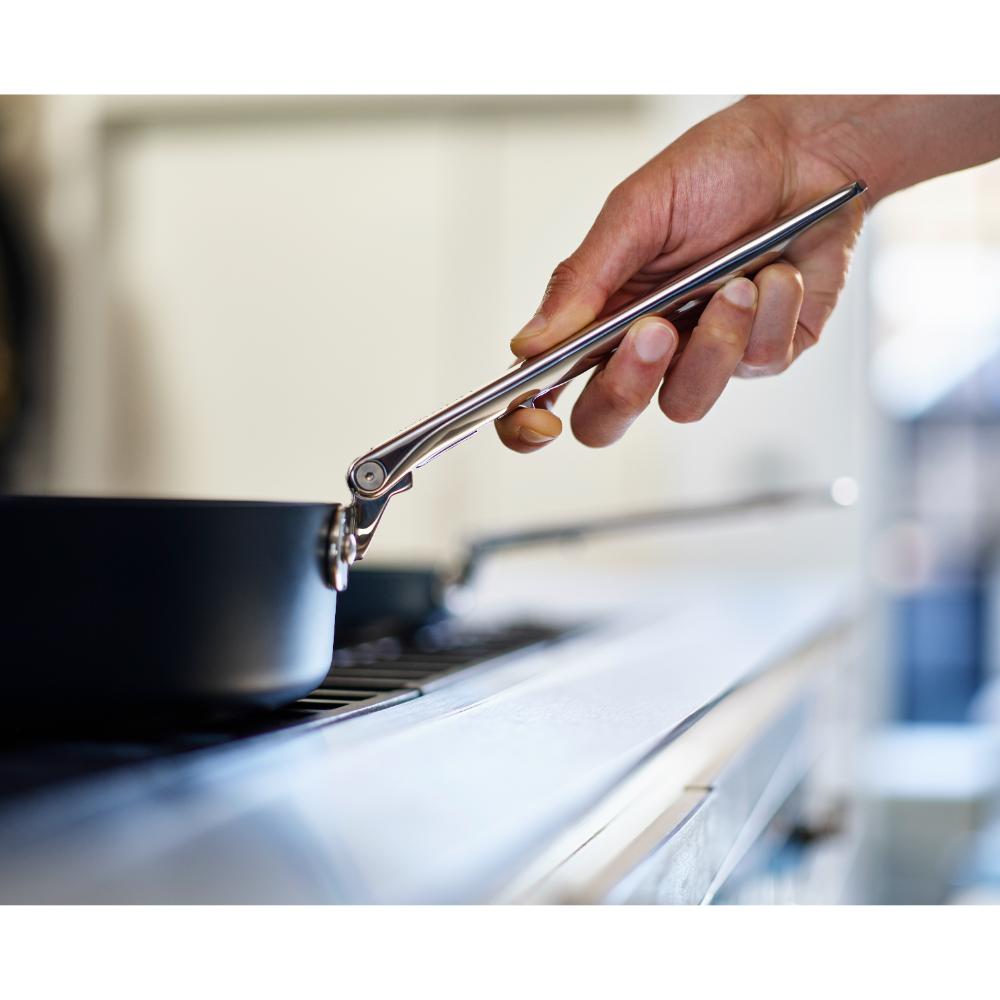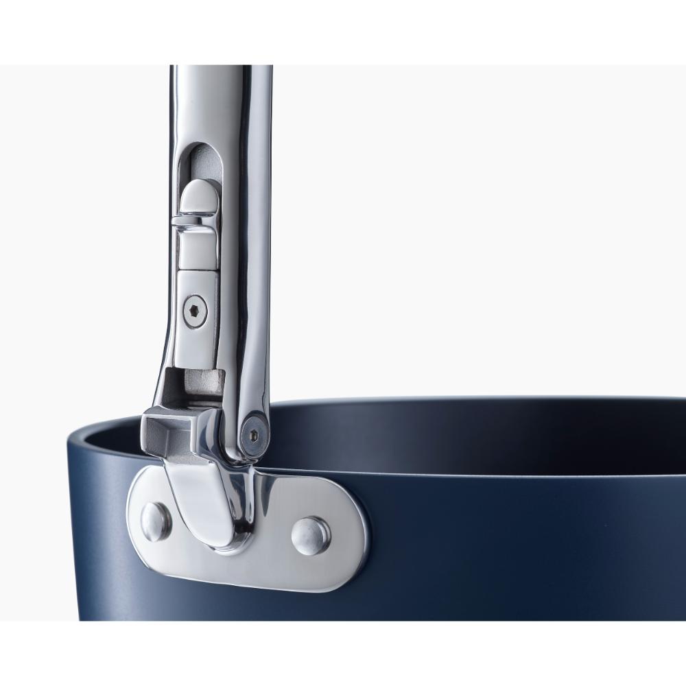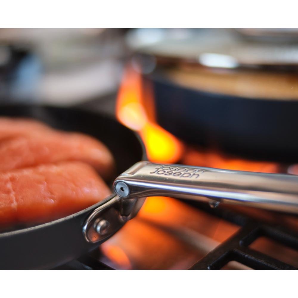 • Nesting design and folding stainless-steel handles save up to 50% more space than a standard 3-piece pan set. Handles 20-year lifetime tested
