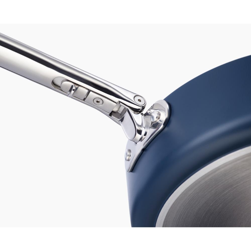 • Folding stainless-steel handle saves up to 50% more space than a standard pan and 20-year lifetime tested