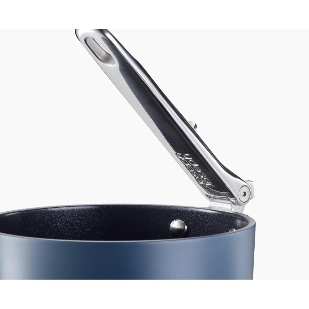 • Folding stainless-steel handle saves up to 50% more space than a standard pan and 20-year lifetime tested