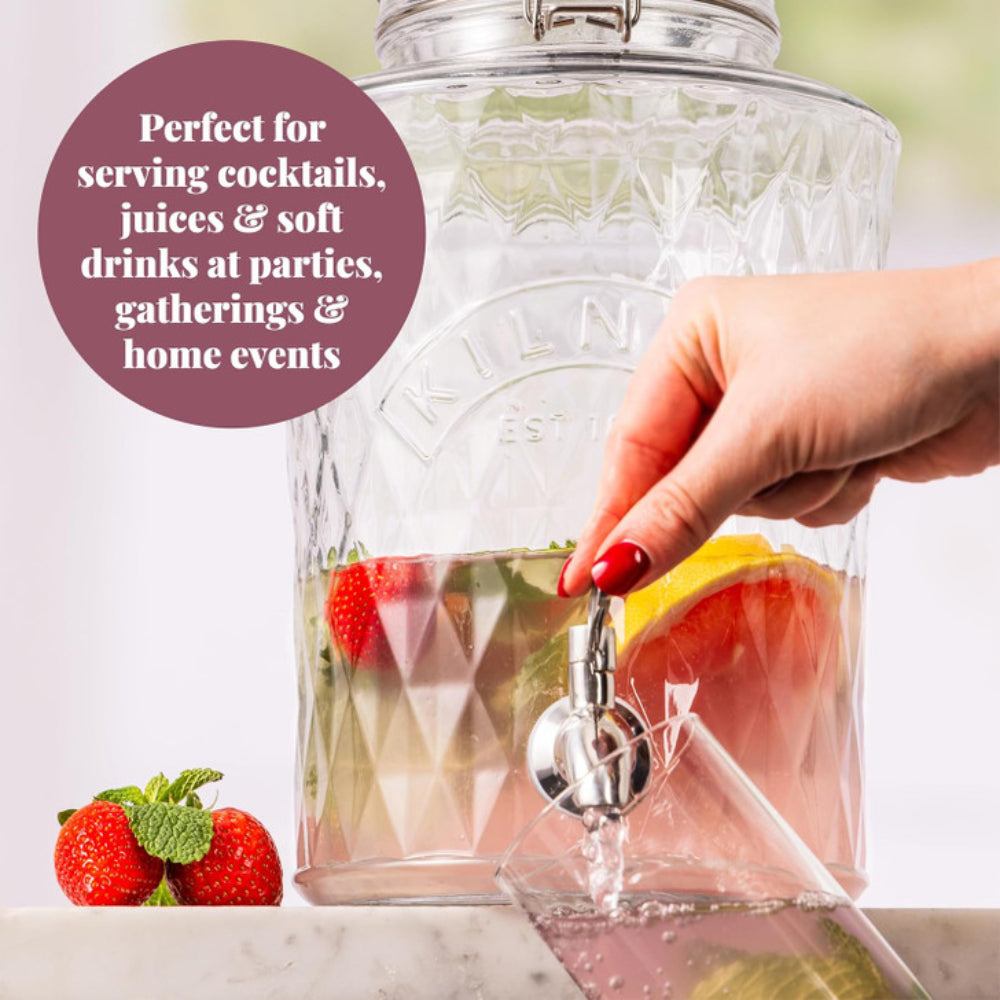 The Kilner Diamond Drinks Dispenser is ideal for serving a variety of beverages, including fruit juices, cocktails, and infused drinks—perfect for home gatherings and parties. With ample space for ice, this dispenser keeps refreshments cool and fresh for longer, making it a stylish and practical addition to any event. The high-quality stainless steel tap ensures a smooth, drip-free pour and is easily removable for effortless cleaning. The innovative silicone seal design maintains freshness while allowing smooth liquid flow, keeping the lid securely closed at all times. Made from durable, high-quality soda lime glass, this dispenser is free from harmful chemicals, odor-resistant, and designed for reuse, refill, and recycle.