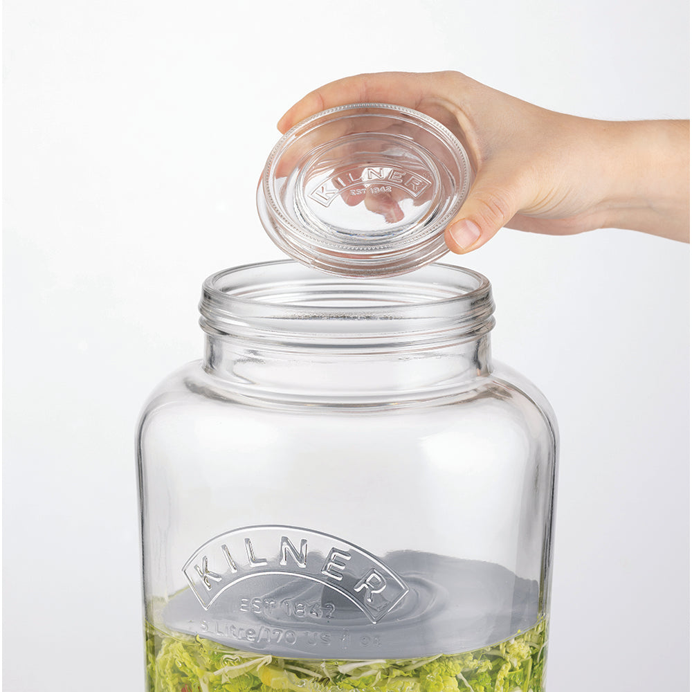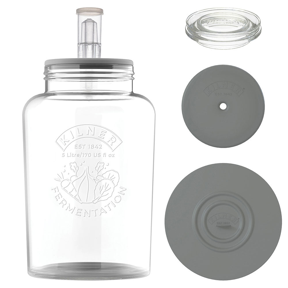 - Includes 1 x 5L fermenting jar, 1 x glass weight, 1 x air lock, 1 x silicone lid, 1 x silicone sheet, 1 x recipe and instruction booklet