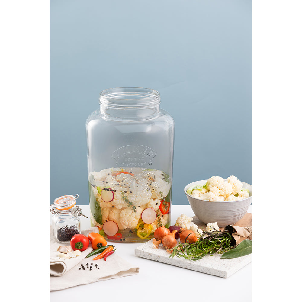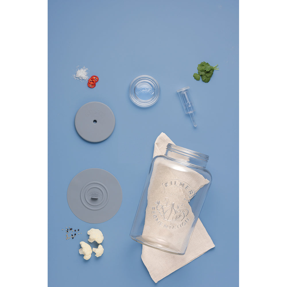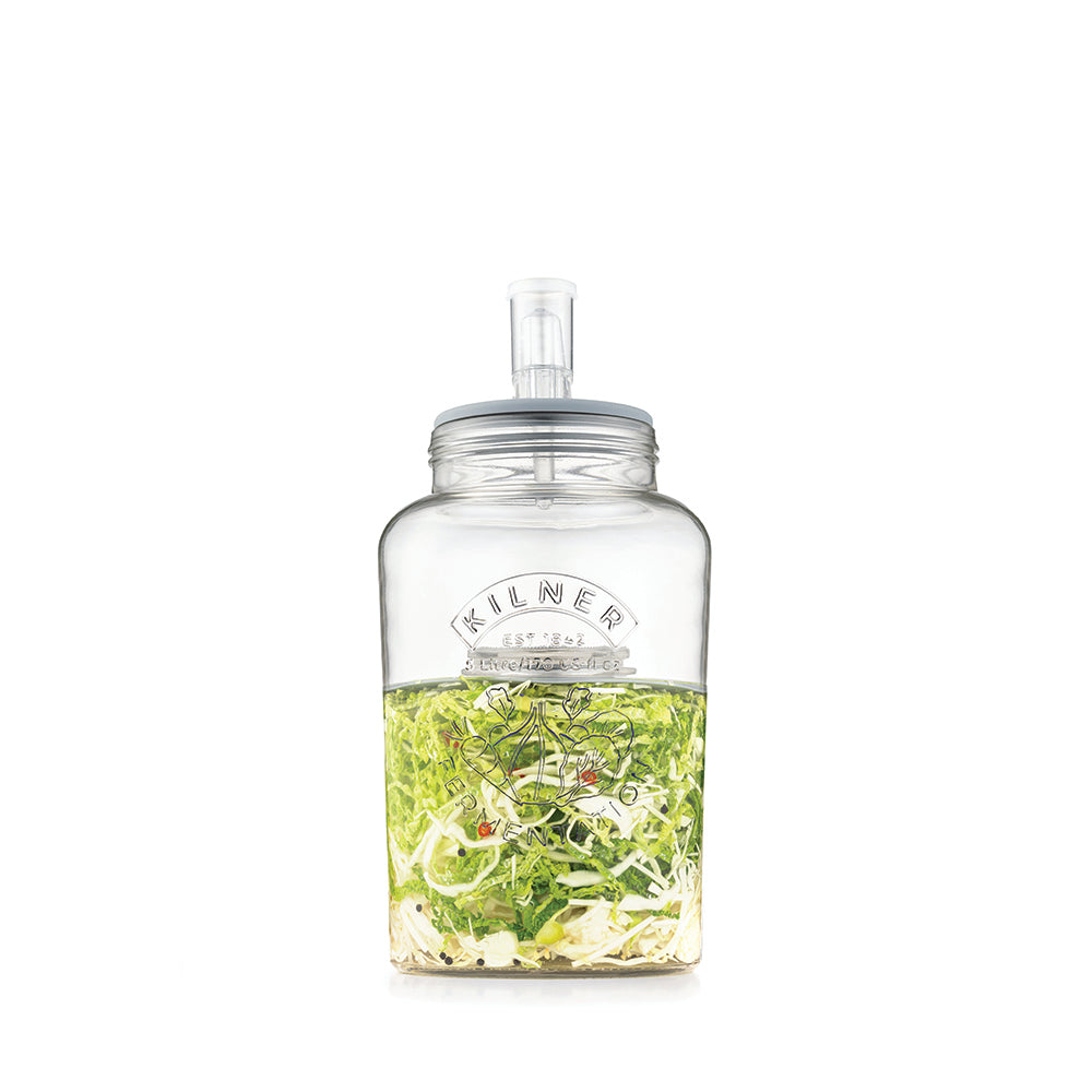 Effortlessly craft large batches of nourishing fermented foods brimming with essential vitamins, minerals, and probiotic cultures with the Kilner® Fermentation Set 5L. This set empowers you to create delectable sauerkraut, kimchi, pickles, and more, all with ease. Simply combine your preferred vegetables, filtered water, and salt, and let the magic unfold. Designed to accommodate substantial quantities, the Kilner® Fermentation Set 5L is suitable for big batches that can later be transferred into smaller jars for convenient storage. With its silicone lid featuring an airlock mechanism, the jar allows the release of gas while keeping air out during fermentation. The innovative silicone sheet and glass weight work in harmony to submerge the contents beneath the brine, preventing spoilage. Presented in a vibrant gift box, complete with a recipe and instruction booklet, this set is perfect for both personal use and thoughtful gifting. Elevate your fermentation game with the Kilner® Fermentation Set 5L.