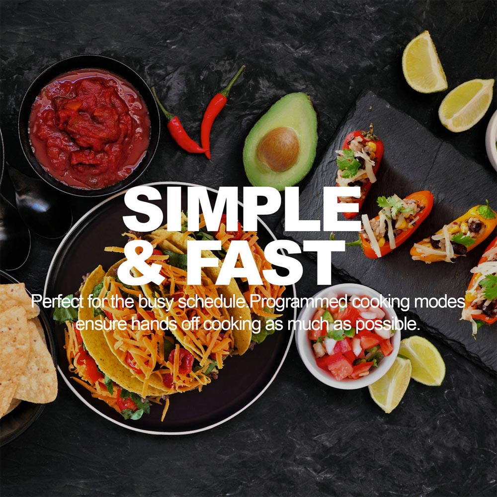 • 8 x Pre-programmed functions (Fries / Cake / Steak or Meat / Chicken / Wings / Shrimp / Roast / Desert)