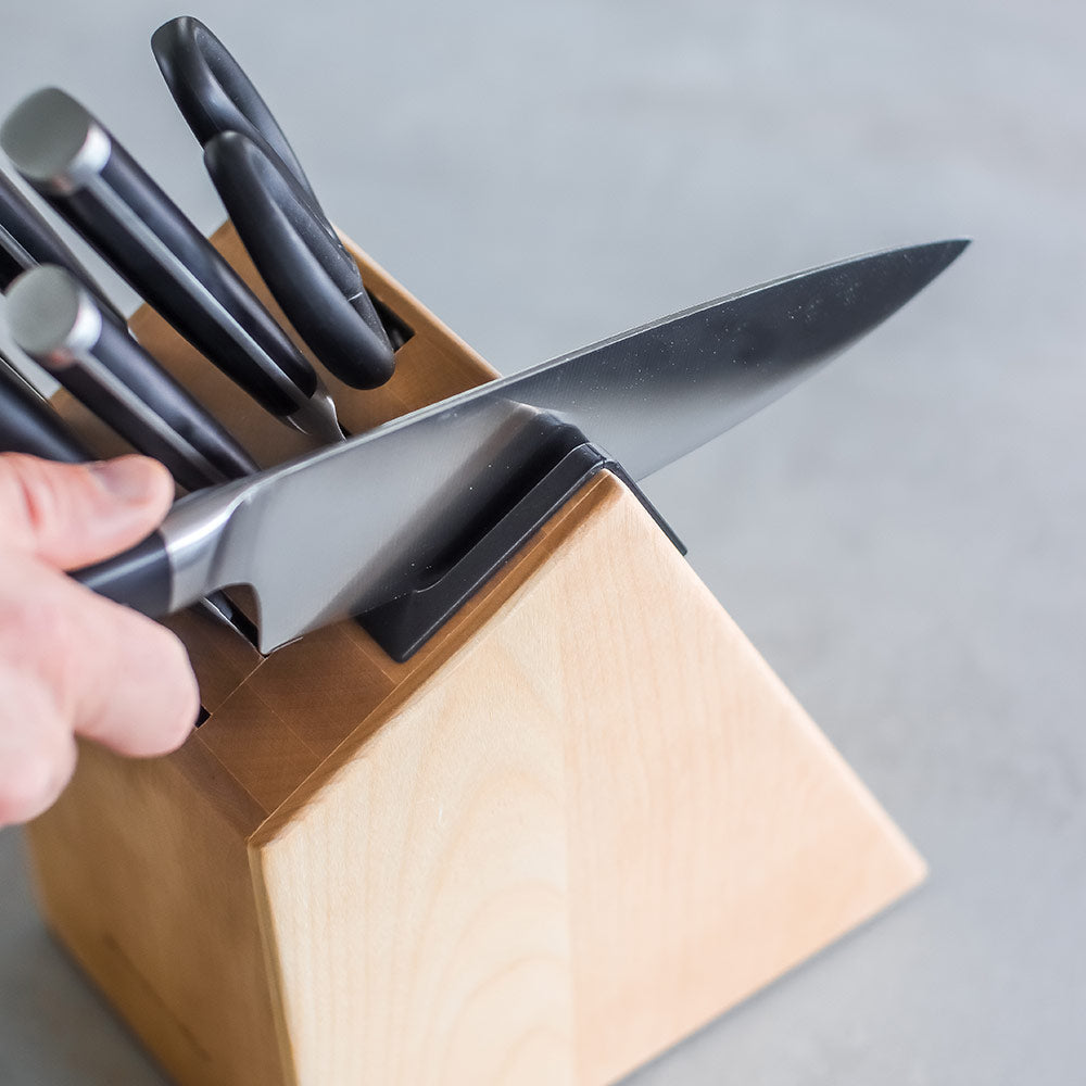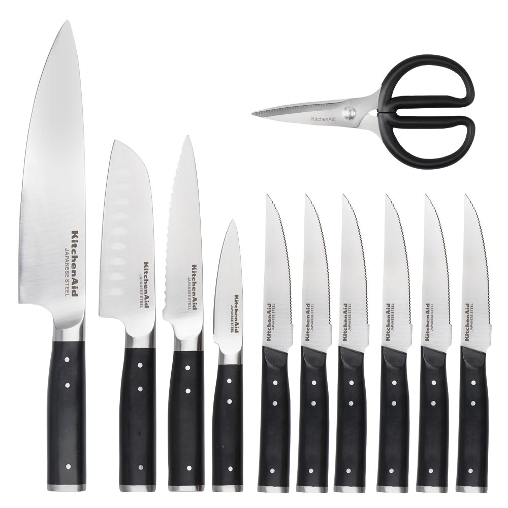 The exceptional KitchenAid 11 Piece Knife Set with Sharpener empowers you to effortlessly blaze through food prep. It includes an array of indispensable tools: all-purpose shears, a 9cm paring knife, 18cm santoku knife, 20cm bread knife, 20cm chef knife and six steak knives. Crafted from semi-polished, high-carbon Japanese Steel, the KitchenAid 11 Piece Knife Set with Sharpener is the epitome of precision and durability. With blades expertly hardened and tempered, you're guaranteed a long-lasting, professional-quality edge. The knives are elegantly housed in a birch wood block that boasts a built-in sharpener, ensuring ultimate convenience and style in your kitchen.