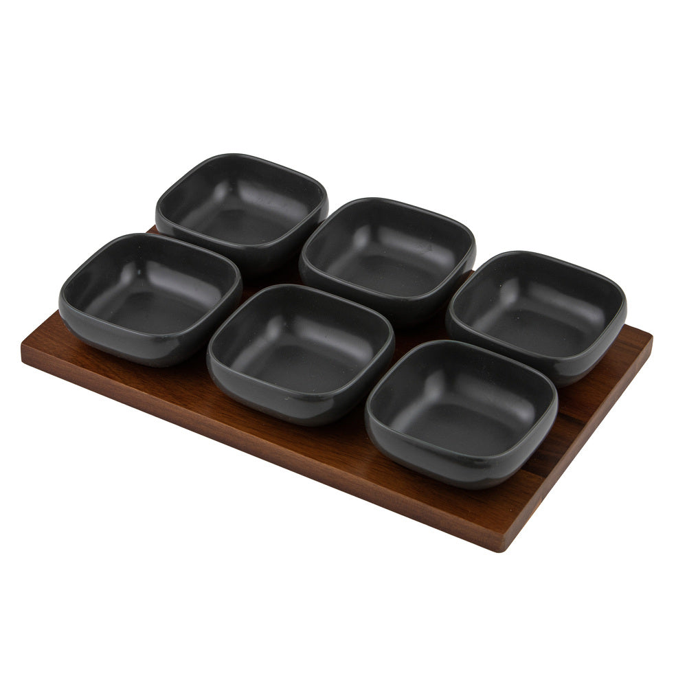 • Bowls crafted from quality porcelain• Acacia wood reversible board