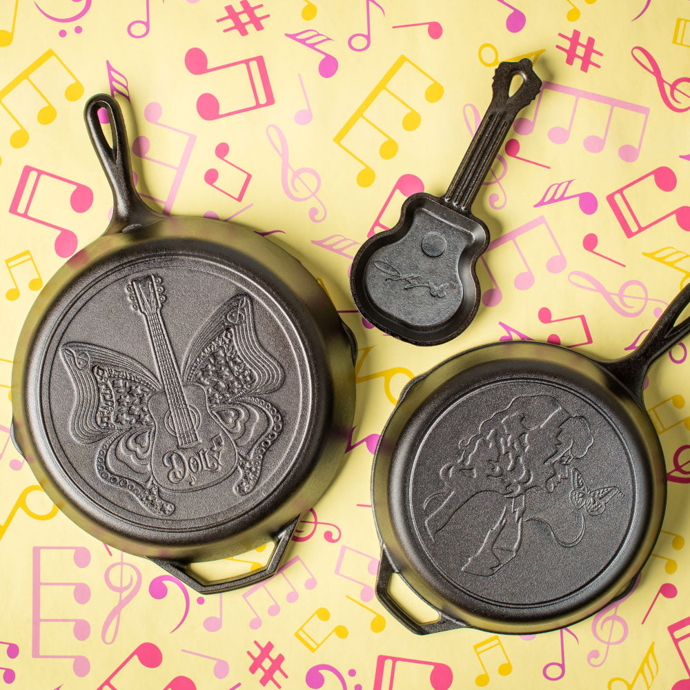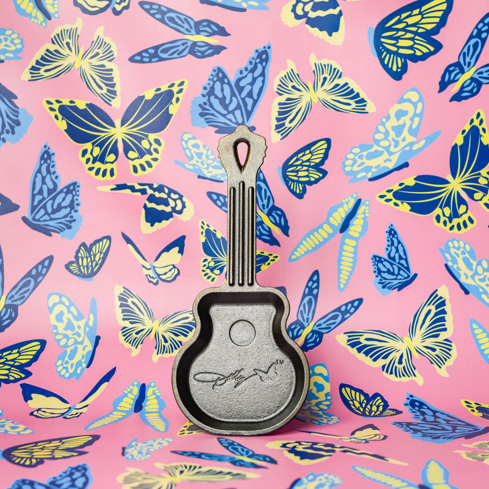 Unleash your inner rockstar with the Lodge Cast Iron Dolly Parton Mini Skillet 11.7 X 10.8cm. Celebrate two Tennessee legends with this collectible guitar-shaped mini skillet, made from premium cast iron and designed in honour of Dolly’s rockstar status, now and always. Seasoned, ready to use right away, and crafted without PFOA or PTFE, this sweet southern skillet is perfect for a single portion of cornbread— but honestly, it makes for great wall decor too with an easy to hang handle. Complete with detailed guitar strings and Dolly’s iconic signature, this piece is a perfect gift for Dolly fans and country music lovers alike.