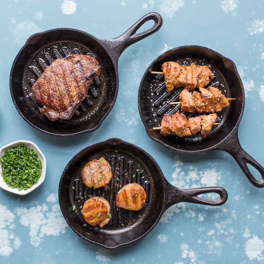 The Lodge grill pan is a great option for small meals or side dishes. The ribs of the pan allow fat to drain from food while also searing tantalizing grill marks onto meats, vegetables and paninis. It also makes a great serving piece.