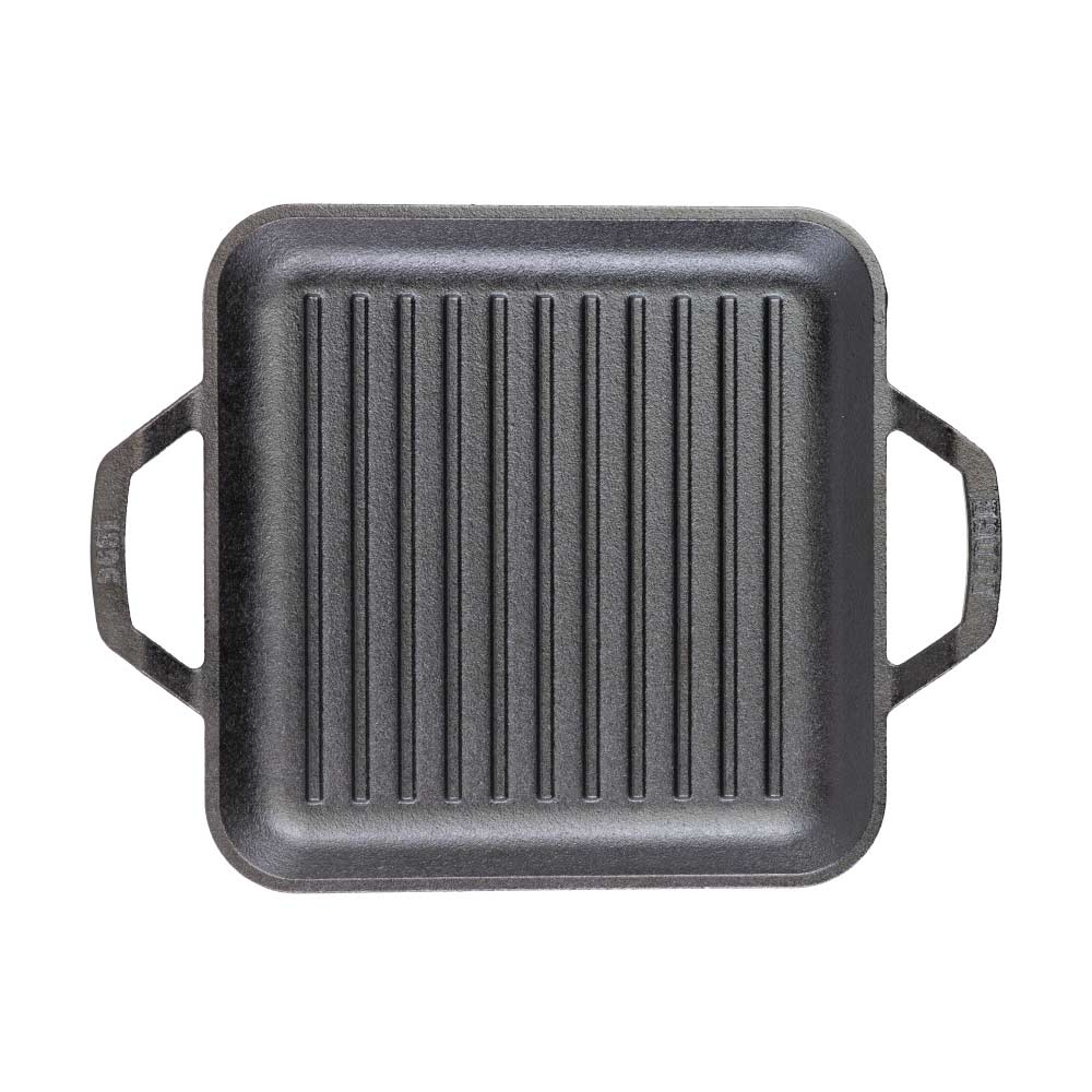 The modern design of the Lodge 28cm Seasoned Cast Iron Chef Style Square Grill Pan elevates cooking through thoughtful design inspired by chefs and is seasoned to bring out rich flavours.