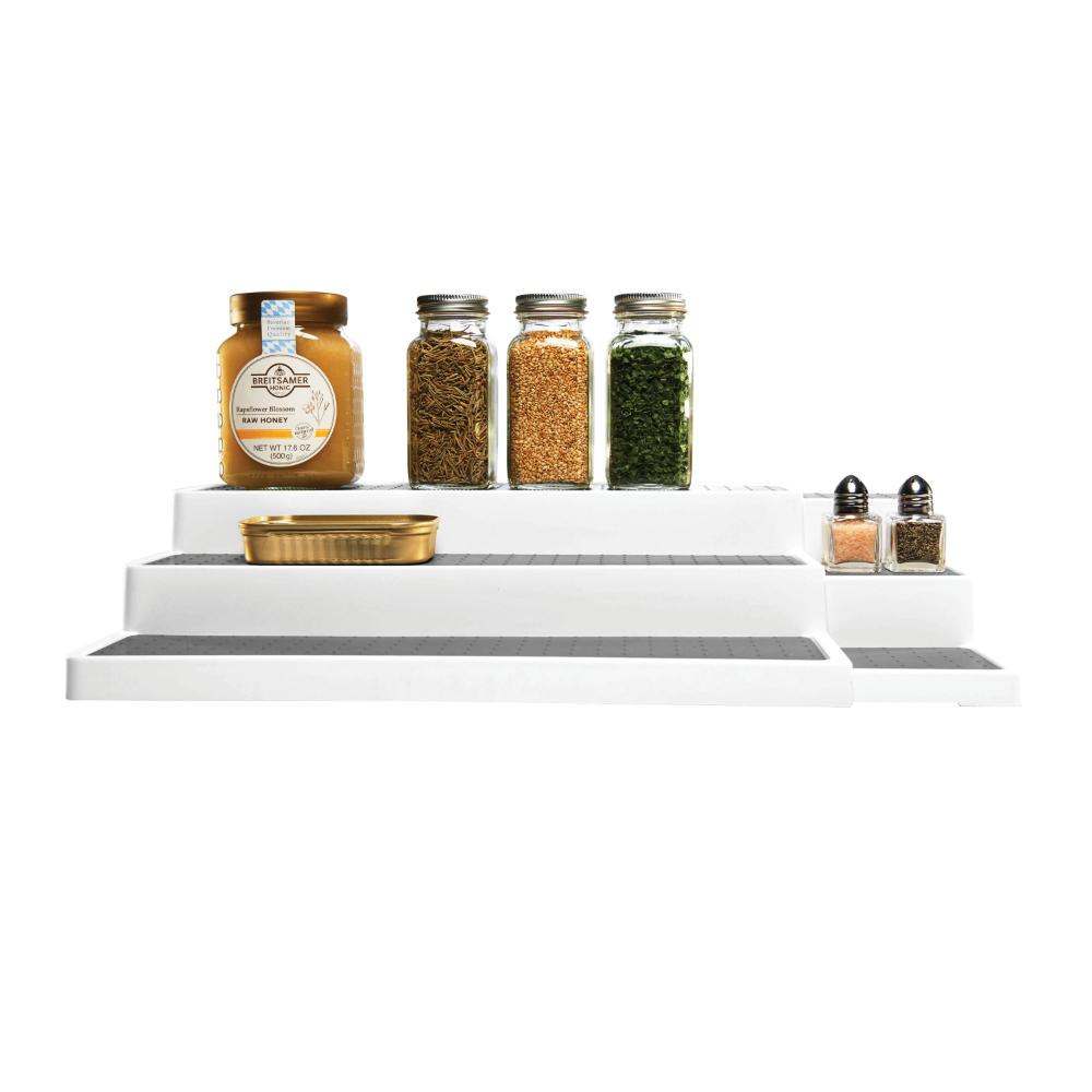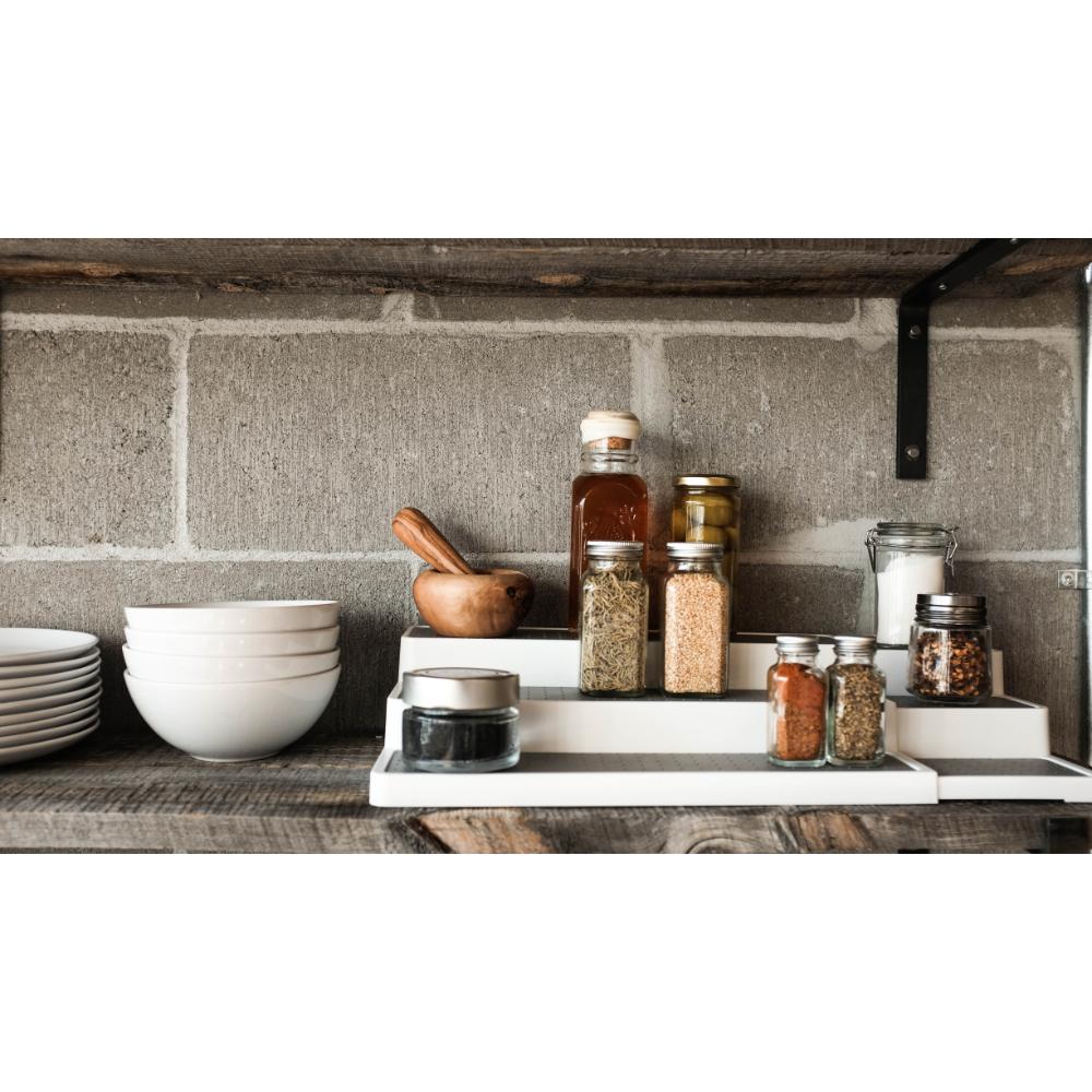 The expandable shelf organiser by madesmart® is the perfect solution for maintaining and organising the kitchen pantry. The organiser expands and contracts to better fit your space and is perfect for organising items like spices, cans, or jars, with the 3-tier design making viewing easy.
