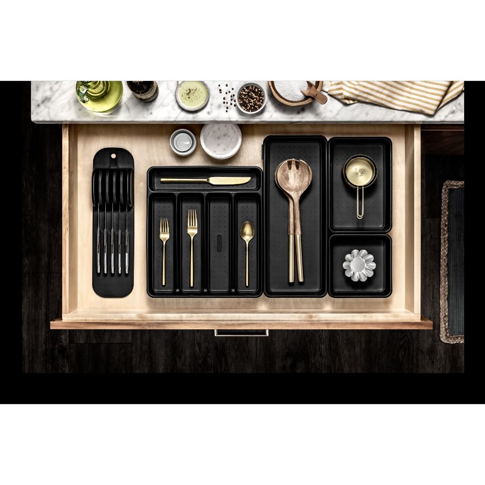 Designed to fit small drawers, the madesmart® 5 compartment cutlery tray helps makes organisation easy. The cutlery tray features rounded corners for easy cleaning, with a soft-grip lining and non-slip rubber feet to keep cutlery and other utensils in place. The tray is made from high-quality, bpa-free plastic for long-lasting organisation.
