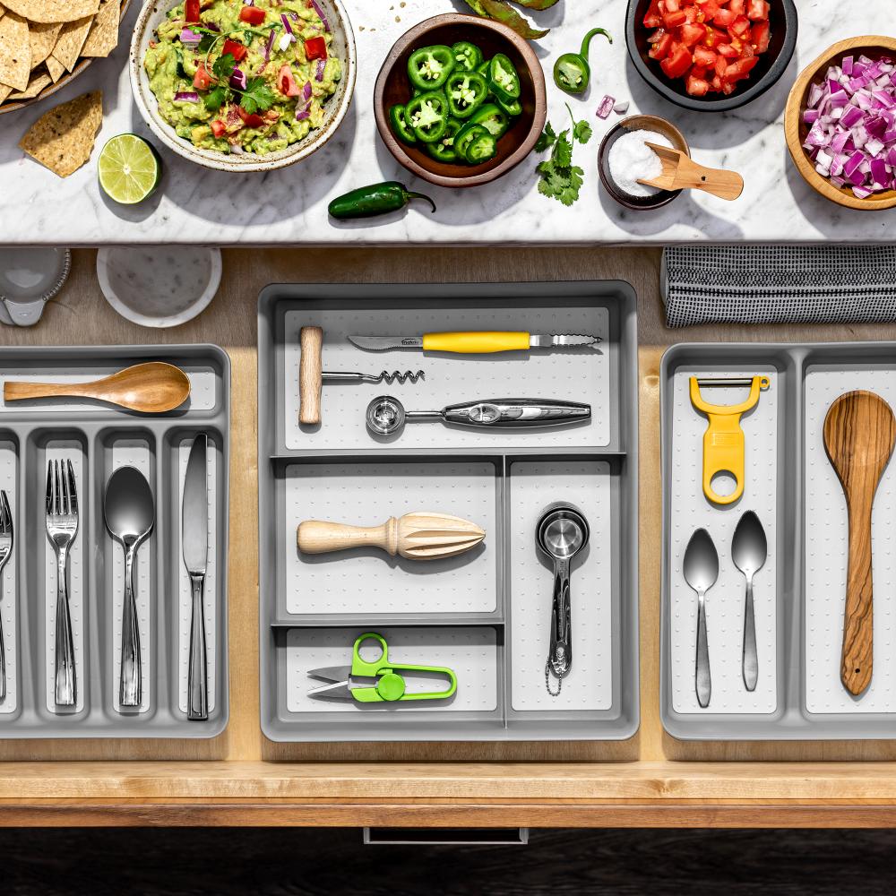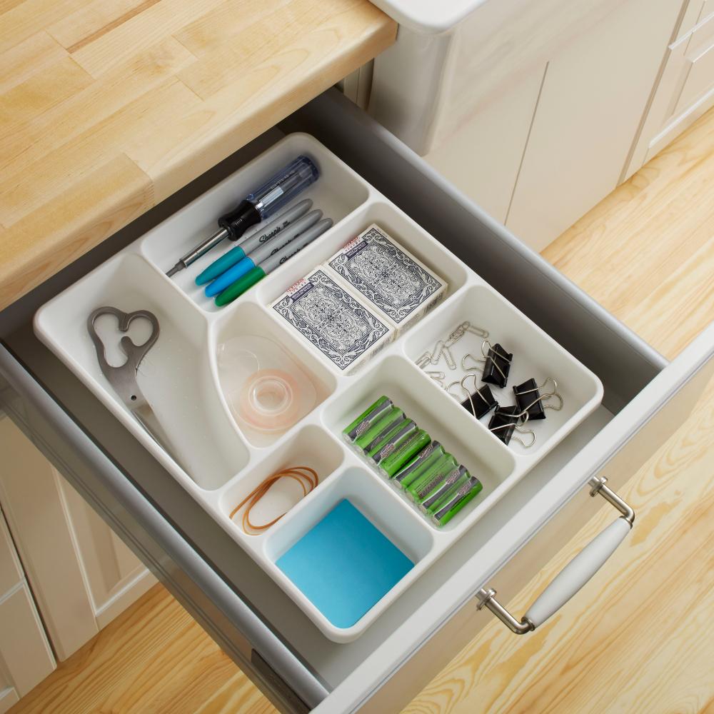 A must have for all households, the junk drawer organiser by madesmart® is made from high-quality, bpa-free plastic, and is built to last. This simple design with clean lines and 4 or 8 varied sized compartments, features soft-grip lining, functioning as a cushioning and grip for all kinds of household bits and pieces, like tools, kitchen or bathroom items and even kids' toy parts.