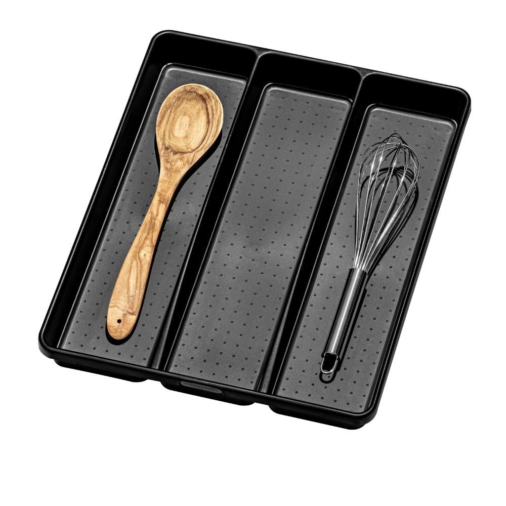 The large utensil tray by madesmart® is ideal for organising kitchen utensils, while promoting cleanliness. As part of madesmart's carbon collection, this utensil tray, made from high-quality BPA-free plastic, has been infused with an EPA certified, antimicrobial additive by sanitized to inhibit the growth of bacterial odours on the product's surface, ensuring a long-lasting, odour-free solution. Its design features 3 compartments for easy organisation, soft-grip lining and non-slip rubber feet to keep items in place. the modern, neutral carbon colour, makes the tray a perfect organisational accessory to suit a range of home décor.