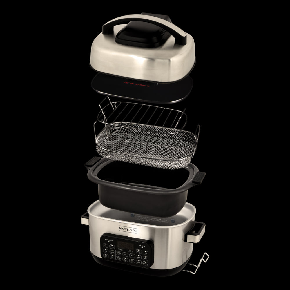 MasterPro is a quality kitchenware brand that equips the home chef with tools to cook like an expert. Our products are designed for superior functionality, durability and style. The 14-in-1 6L Deluxe Multi Cooker + Air Fryer lets you create delicious family feasts by combining multi cooker and air fryer functions in one handy appliance. The dual lid functionality lets you effortlessly transition between air fryer and multi cooker modes by switching lids. Its 6L capacity along with Delay Start and Keep Warm functions lets you cook large meals for family gatherings or meal prep in advance. Features 14 preset options including sauteing, slow cooking, broiling, baking, steaming and more. Enhance your cooking experience with the 14-in-1 6L Deluxe Multi Cooker + Air Fryer from MasterPro.