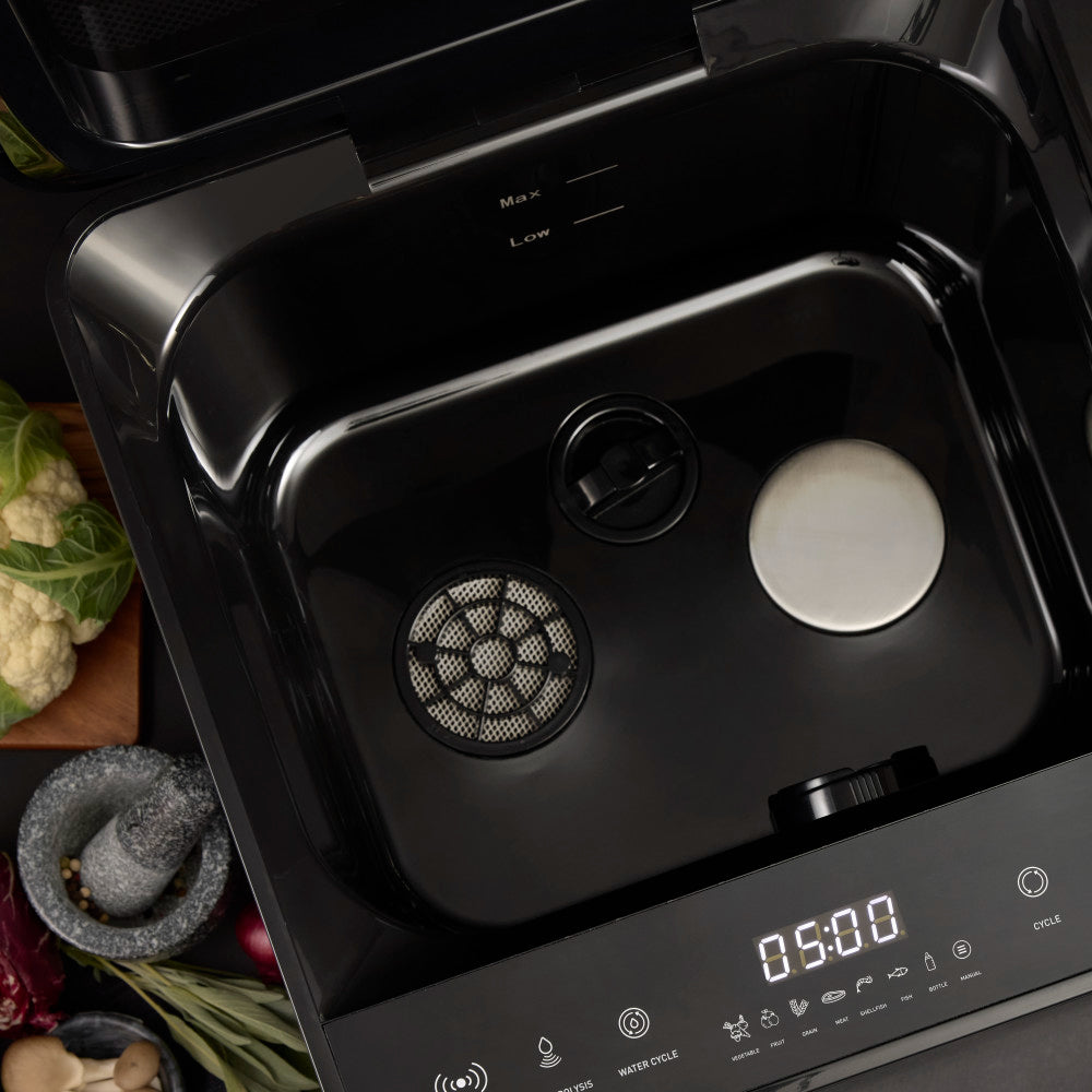 • Uses ultrasonic technology to clean and gently remove dirt• Electrolysis Cleaning to sterilize and remove pesticide residue from food