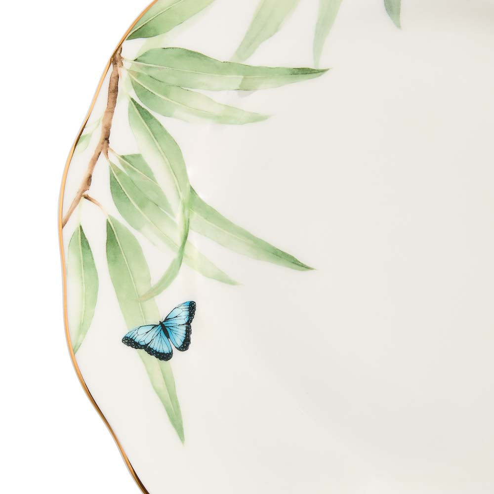 Serve in style with this gorgeous Miranda Kerr for Royal Albert Australiana Plate 27cm from the Miranda Kerr Australiana Collection. Showcasing the vivacious patterning that defines the unique floral design, the bone china piece is presented in a pristine white that matches any table setting. The motifs feature beloved references from Kerr's Australian upbringing, including cockatoos and eucalyptus, and the plate is finished with stunning gold banding for a luxurious flourish.