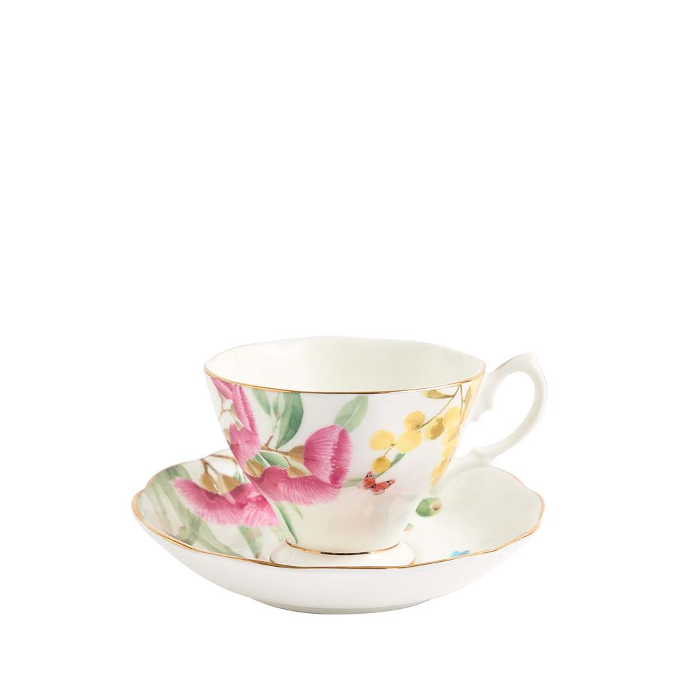 Turn the humble hot drink into a colourful occasion with this elegant fine bone china Miranda Kerr for Royal Albert Australiana Teacup, Saucer & Plate 3 Piece Set. The pattern is from the imagination of Miranda Kerr and features native flora and fauna from her homeland with proud cockatoos and fresh eucalyptus drawn proudly across the piece. Featuring a saucer, plate and cup with a beautifully designed and distinct handle, this set is ideal for gifting as it is presented in a gift box finished with the Australiana pattern.