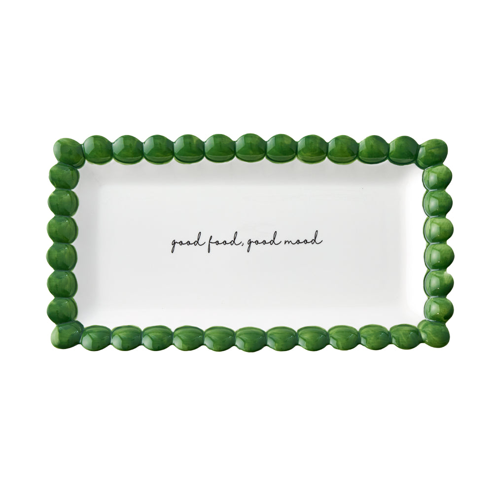 • Serve up tasty treats on our “good food, good mood” platter• Hand painted green border