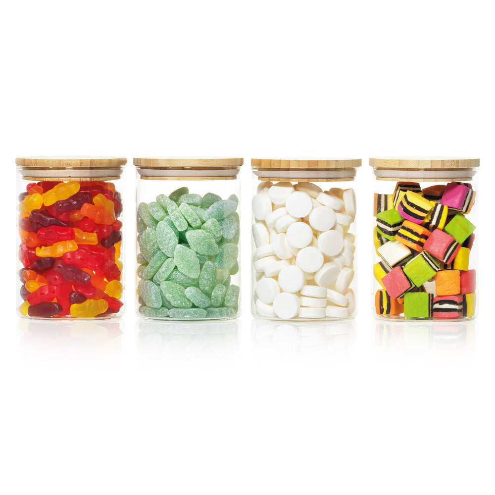 The Scullery® Bamboo 4 Piece Round Canister Set features clear, stackable storage canisters that are ready to be filled with your favourite dry goods. The airtight lids are crafted from bamboo, making canisters an environmentally friendly and space-saving option. Bamboo is a hard grass that is sustainable and a renewable resource that needs no chemicals to thrive or be harvested. The body of the canister is made from borosilicate glass, which leaves a smooth and polished finish while being resistant to stains, food odours, germs, or even smells seeping into your glass containers. Maximize your pantry space as these canisters are stackable and will easily store and organise your ingredients or snacks!