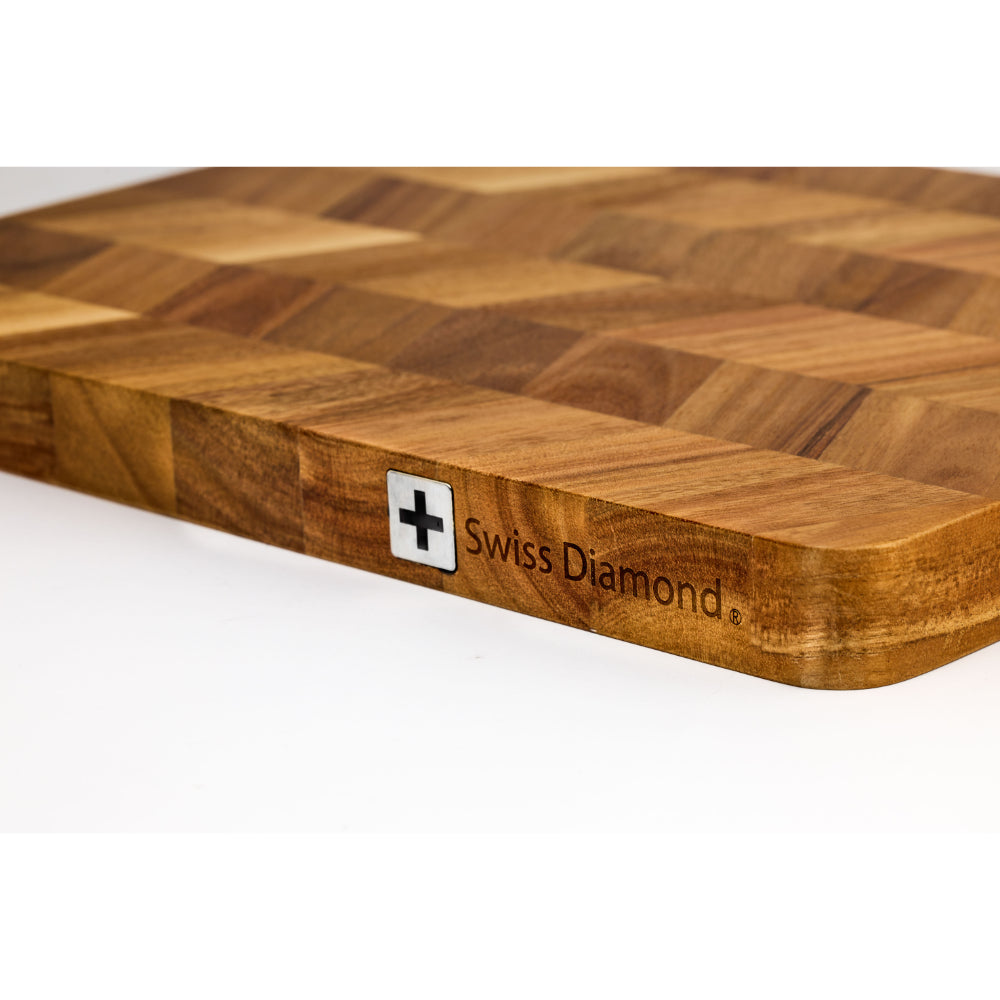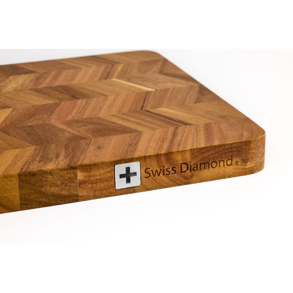 Perfectly reflecting the high-quality standards of our cookware, the Swiss Diamond DLX Premium Kitchen Herringbone Cutting Board is the perfect accessory for any cook kitchen, home chef, or professional. Use for food prep, as well as food serving and display. The perfectly sized block is great for preparing dishes, chopping ingredients, slicing, and dicing. The bold, geometric herringbone pattern showcases artisanal craftsmanship and adds visual interest to your kitchen. Acacia wood is a strong hard wood to withstand daily chopping slicing and prepping, while gentle on knife edges to help maintain blade sharpness. Rounded corner and smooth finish, comfortable to handle and easy to clean, with seamless finish that resists moisture absorption. Recessed groove on each short edge offers a secure, comfortable grip, makes it easy to lift and carry. Care and clean-up are easy for this board, hand wash (do not fully submerge) and dry with a dish towel. Allow to air dry before storing.